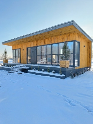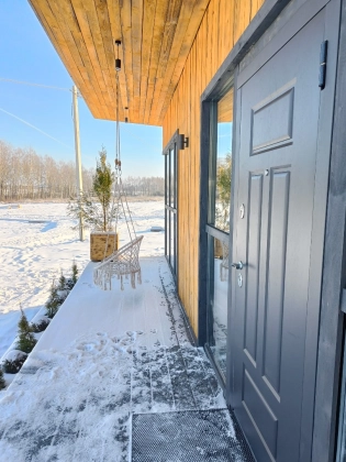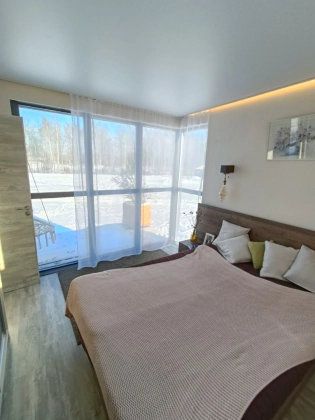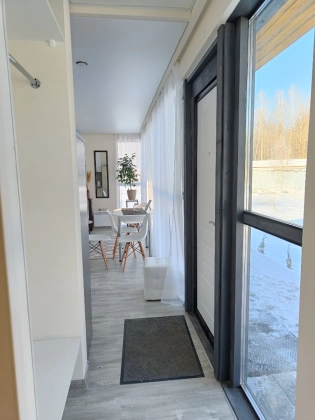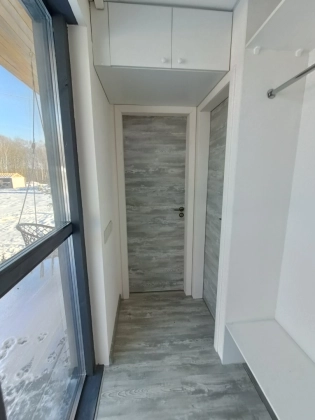 Внутренняя отделка: стены гипсокартон с одним слоем шпаклевки подготовлены для наклейки обоев, покрытие пола - ламинат, потолки - натяжные, оборудованы вентиляция пассивная и принудительная, оборудованы двери в спальную комнату, в совмещенный санузел и гостиную (в проектах с двумя комнатами), разводка электрики, установка разеток, выводы под канализацию и воду( в санузле и кухне), откосы под окнами, освещение доме, в санузле будет установлен унитаз и рукомойник, также оборудована душевая зона.