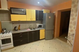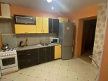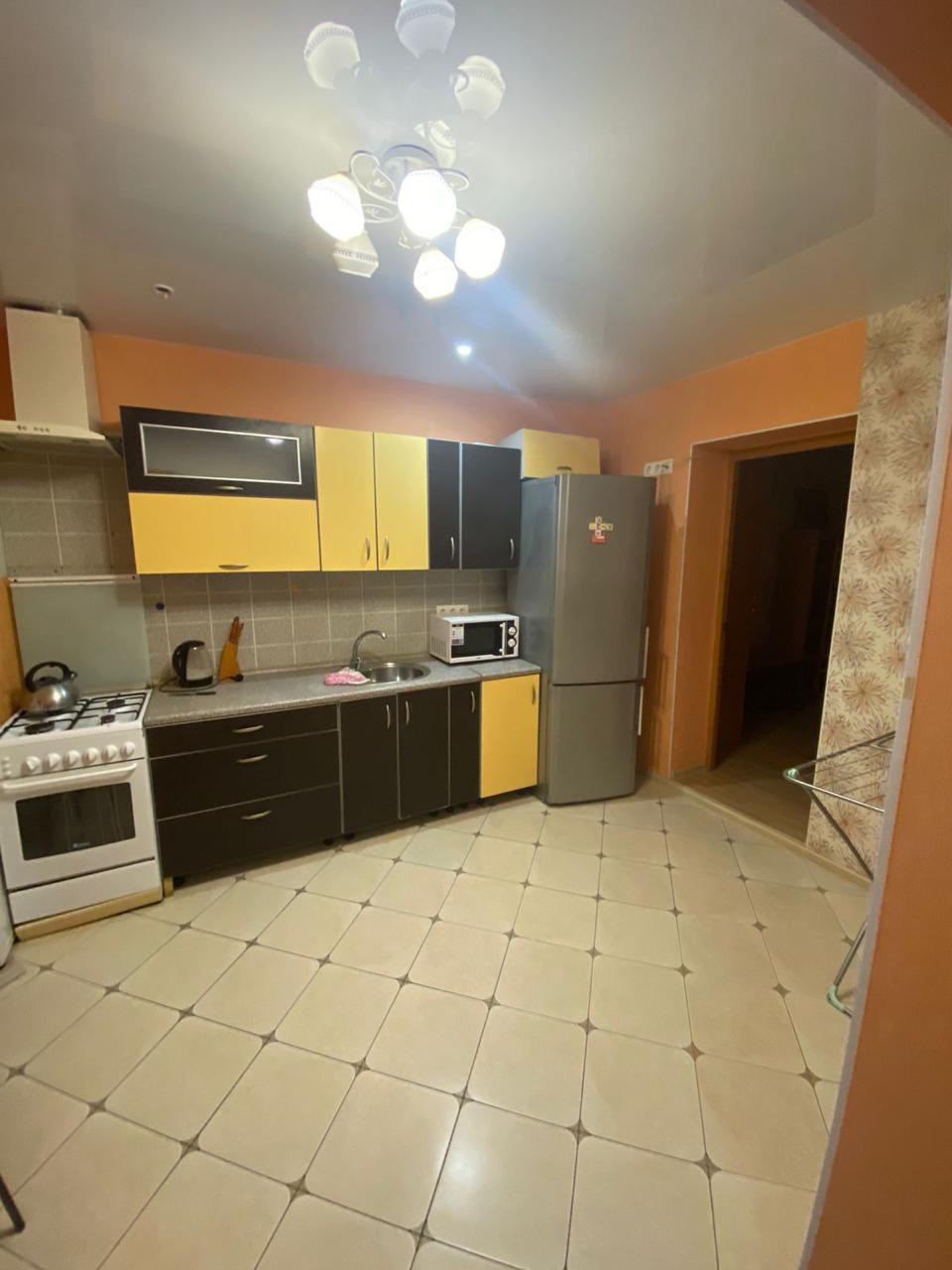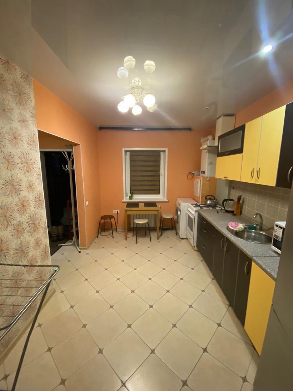 Полностью укомплектованная кухня с холодильником, плитой, микроволновой печью, чайником, кухонным столом, стульями, очень просторная.