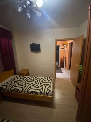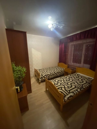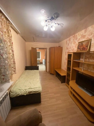 Две раздельные комнаты с кроватями и шкафами, гостиная с диваном, телевизором (совмещена с кухней).